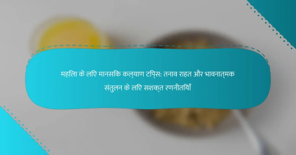महिलाओं के लिए मानसिक स्वास्थ्य टिप्स में माइंडफुलनेस प्रथाएँ, शारीरिक गतिविधि और सामाजिक संबंधों को बढ़ावा देना शामिल हैं। ये रणनीतियाँ तनाव राहत और भावनात्मक संतुलन को बढ़ावा देती हैं।